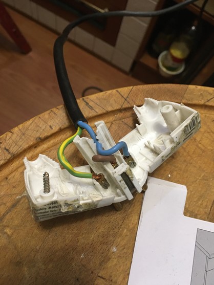 Ezt a villásdugót egy beépített sütőről vágtam le. A konyhabútor összeszerelésekor szerelte fel valaki így ezt a villásdugót, aki nem értette mit jelent a gyártó által egyértelműen megjelölt 3 vezeték. Akkor még nem volt életvédelmi relé (ÁVK, FI relé) felszerelve a házban. Így kizárólag a szerencsén múlt, hogy nem történt súlyos baleset.